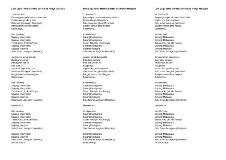 Listen to Kita Punya Malaysia on Spotify. Kita punya malaysia lyrics. Untuk tahun 2018 lagu Kita Punya Malaysia nyanyian kumpulan Bunkface dan dicipta oleh vokalisnya Sam dijadikan sebagai Lagu tema Hari Kebangsaan 2018.